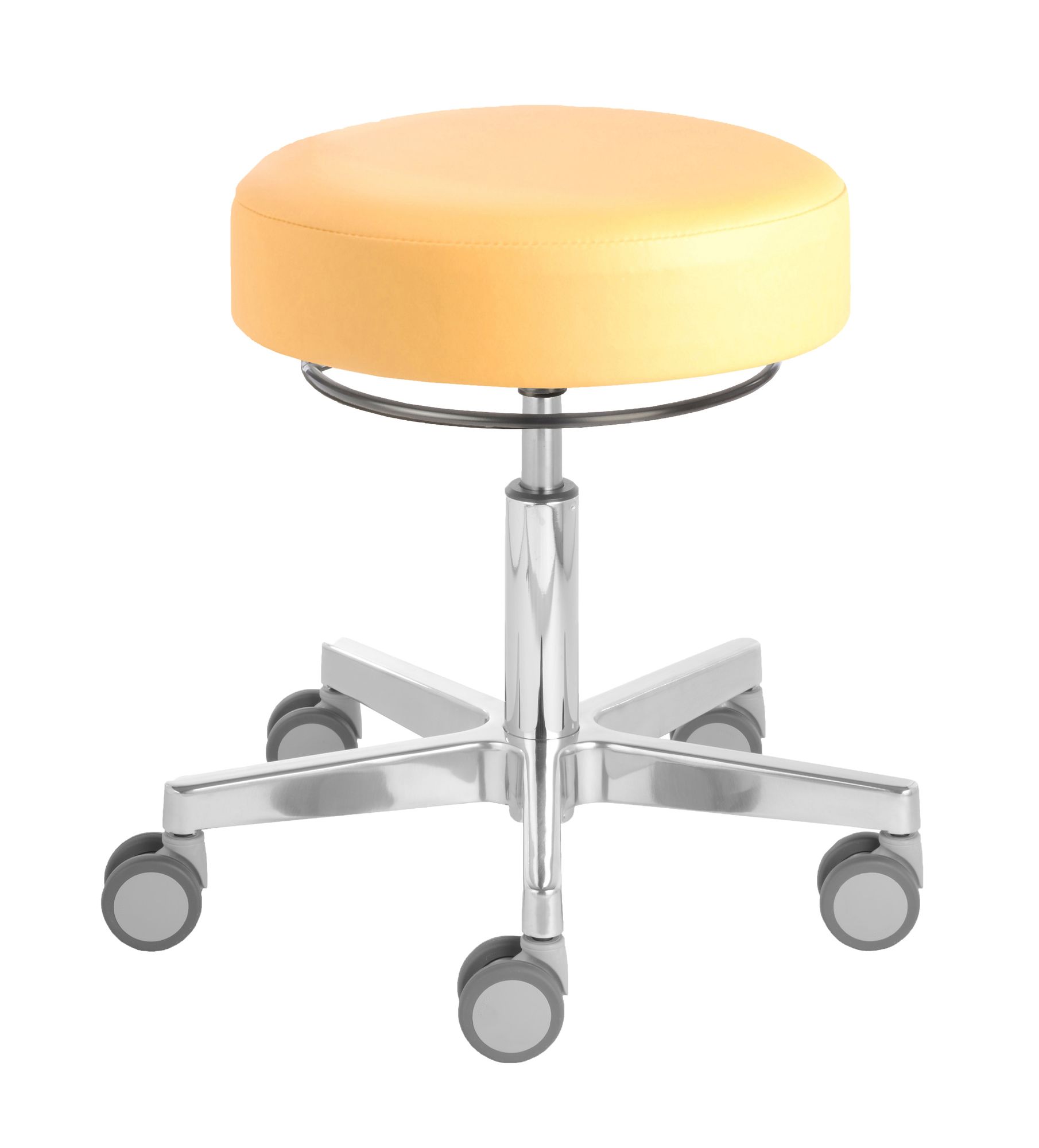 Roll- und Drehhocker Puffi® Le Mans 4380, Sitzhöhe ca. 48 - 61 cm, Rundsitz, umlaufende Ringauslösung, stufenlose Höhenverstellung, Aluminium-Fußkreuz, Rollen ø 65mm, vollverkapselt, gute Laufeigenschaften