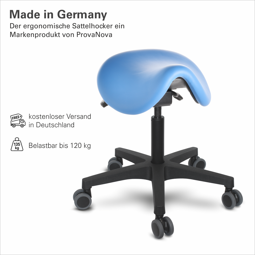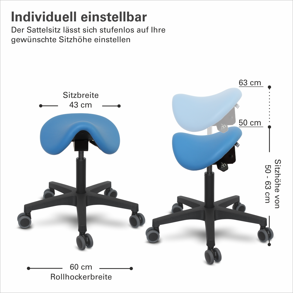 - Handwerklich gepolsterter Sattelsitz, Sitzbreite ca. 430mm, Sitztiefe ca. 350mm,atmungsaktiv,antimikrobiell. Antiviral, phthalate-frei, abriebfest, desinfektionsmittelbeständig